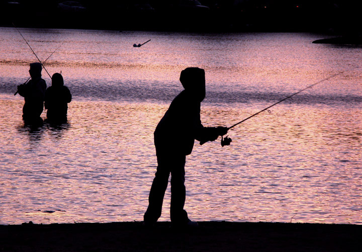 Youngsters enjoy the warm evening as the sun goes down to do some fishing at the pond at Buttonwood Park.