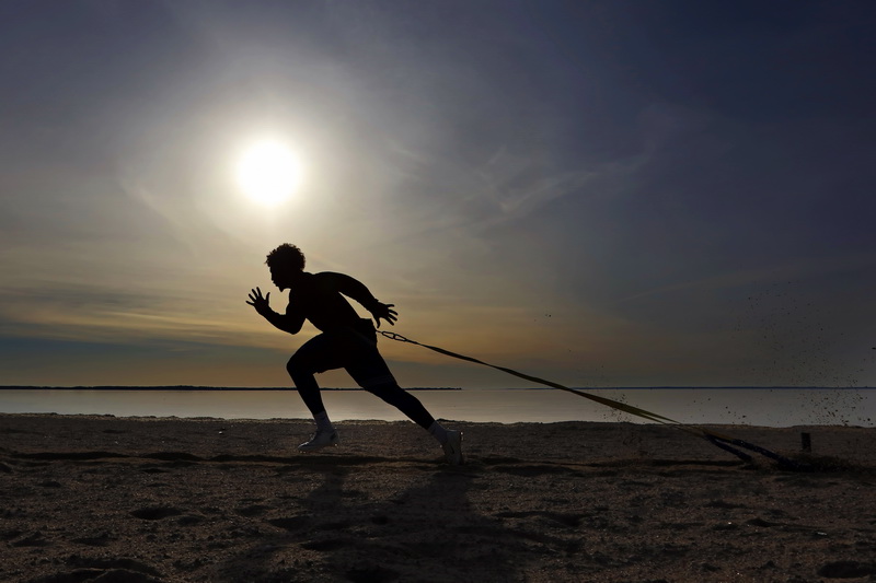 UMass Dartmouth student, John Veiga has decided to start his training for the next football season early with early morning weighted-sled sprints on the beach in the south end of New Bedford, MA.
