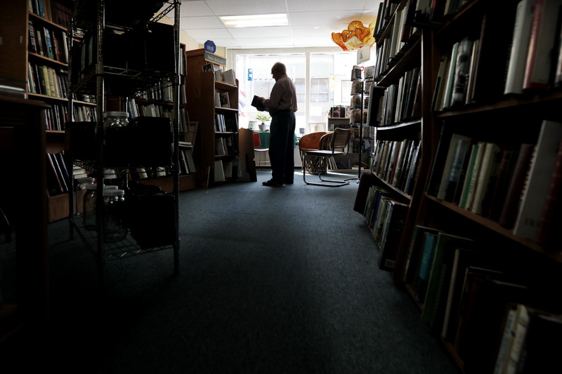 Laurence Jaquith, proprietor of Subtextbookshop, files New Arrival books at his downtown New Bedford book and framing store on Union Street.