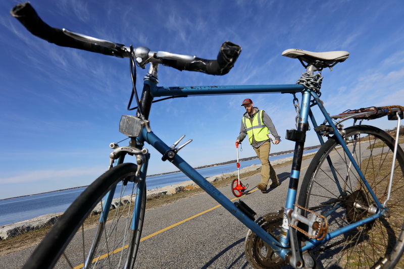 Troy Durr, a civil engineer with the city of New Bedford, walks past a bike of a cyclist taking a break at Fort Taber Park in New Bedford, as he uses a measuring wheel to determine the full distance of the new Blue Lane.  The Blue Lane compromises the Covewalk, Harborview and Riverwalk bike/walk paths that circumvent the south end peninsula of New Bedford.  This will be the first time that an accurate measurement will be made.