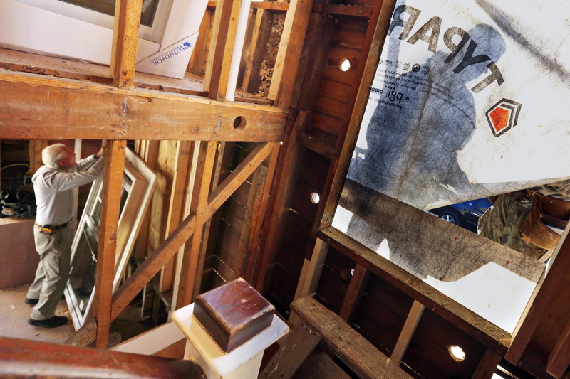 The shadow of a worker installing the vapor barrier is seen through the window opening on the right as another worker, left, prepares the window that will be installed in it at a home being remodeled in Padanaram harbor in Dartmouth, MA.