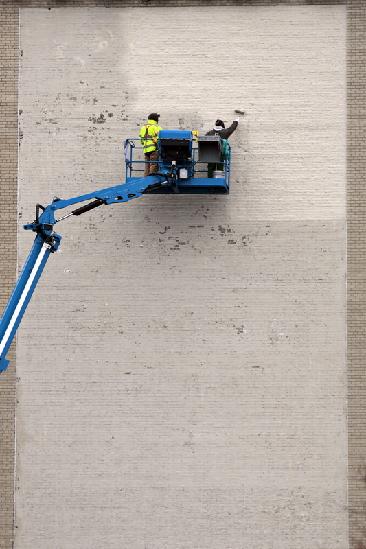 Two workmen are seen high above New Bedford painting the side of the Webster Bank building downtown.