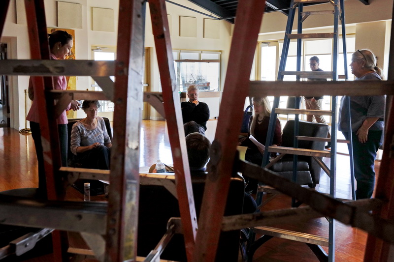 Members of the Whaling Museum committee preparing for a major exhibit this summer, are seen between the rungs of the ladders they used to test out some of the designs they came up with to display the piece.