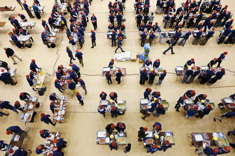 UMass Dartmouth faculty, staff, and students, are joined by community members in packaging 20,000 nutritious meals for developing nations in the schools gym, as part of the RISE Against Hunger program.