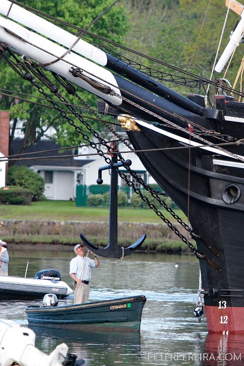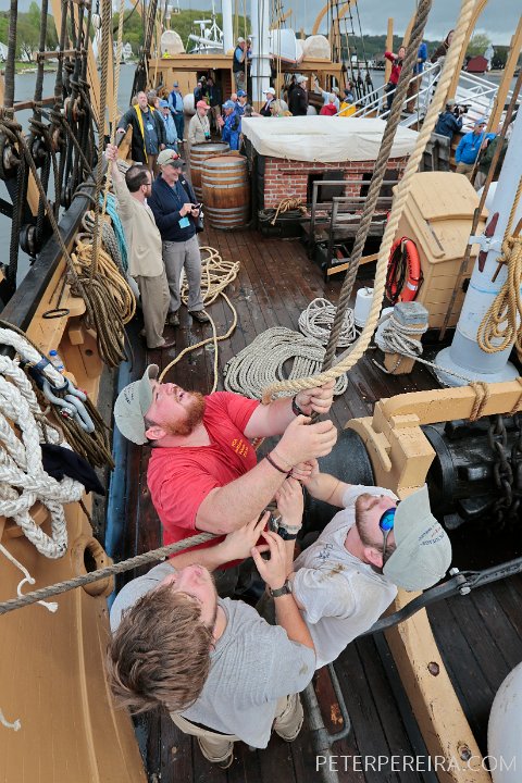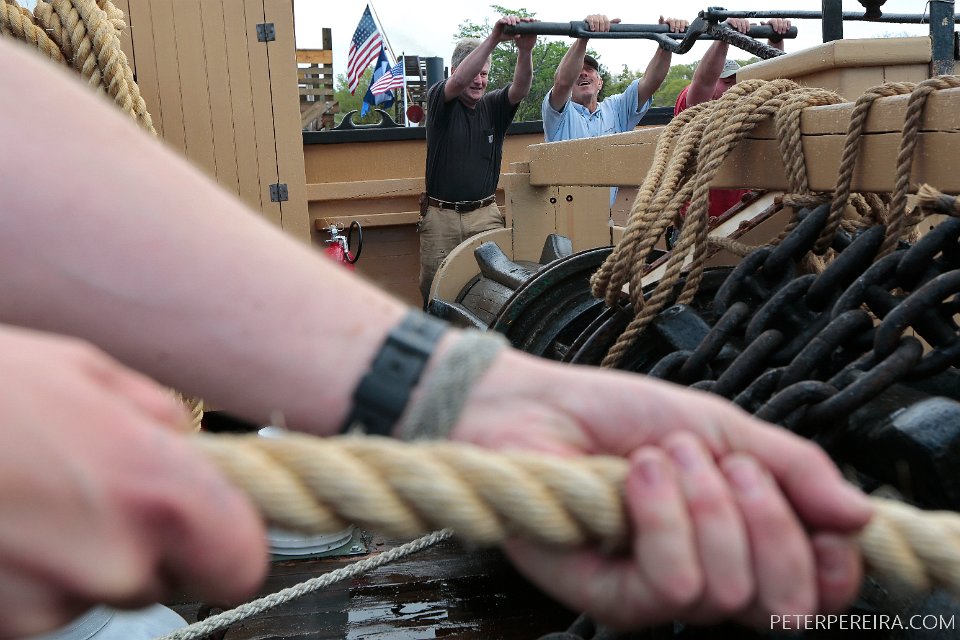 14_N8A1871 PHOTO PETER PEREIRA/The Standard-Times ++ Crewmembers hoist up the anchor before casting off from Mystic, CT. The Charles W. Morgan whaleship makes her way from Mystic Seaport in Mystic, CT to New London, CT in the first leg of the journey that will see it return to New Bedford in June.