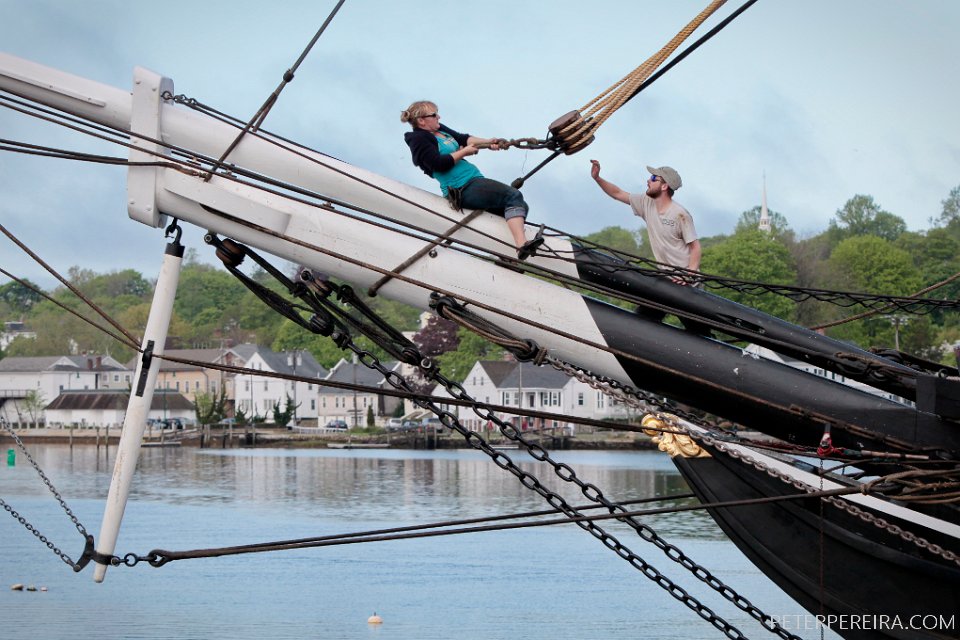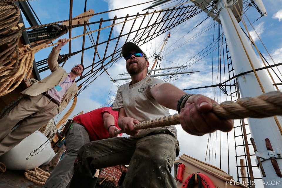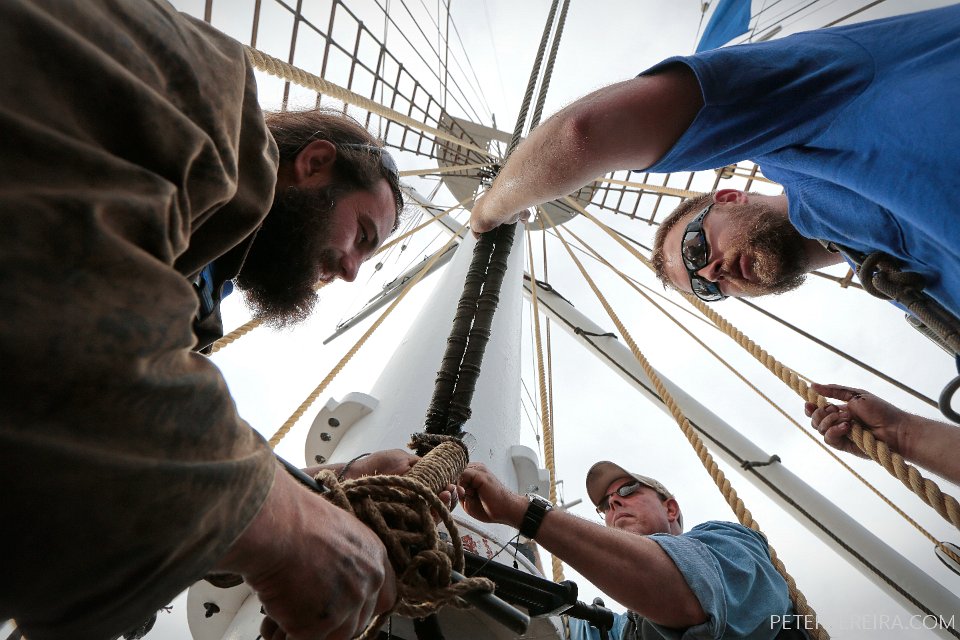 6_N8A1858 PHOTO PETER PEREIRA/The Standard-Times ++ Crewmembers make some final adjustments to the rigging of the Charles W. Morgan before casting off. The Charles W. Morgan whaleship makes her way from Mystic Seaport in Mystic, CT to New London, CT in the first leg of the journey that will see it return to New Bedford in June.