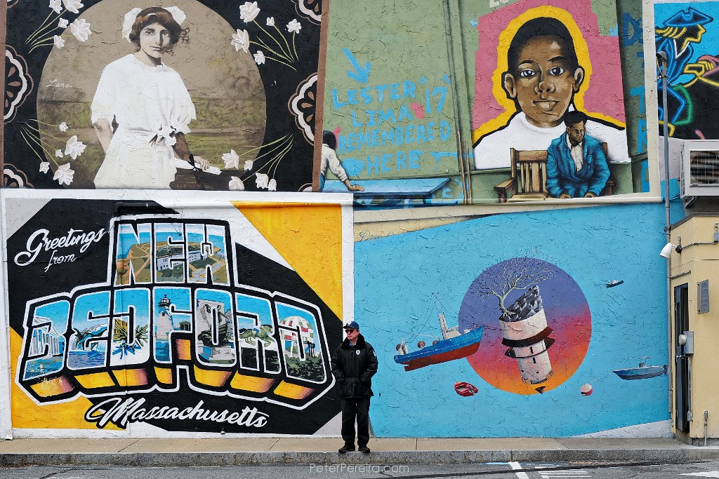 55L1013150 Security guard Jim Cabral is flanked by a set of colorful 'postcard' murals as he monitors parking at the Bank of America parking lot on Elm Street in downtown New Bedford.