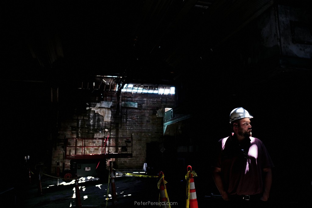 71L1014171 Daniel Whitaker of AP Whitaker & Sons general contractor is illuminated by a ray of light inside the former Capitol Theater location on Acushnet Avenue in New Bedford which will be developed into a retail space along with six mixed-income housing units.
