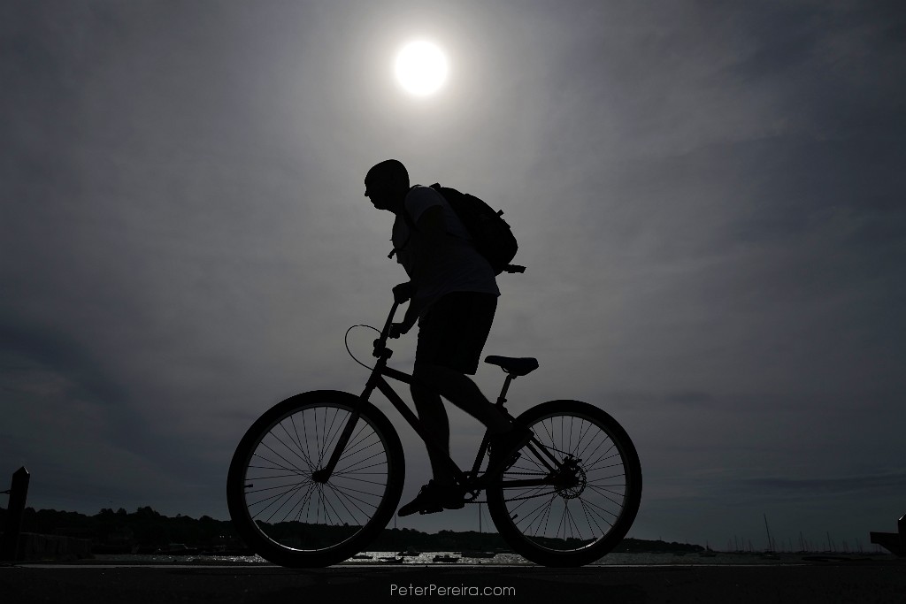 72L1014431 The sun rises on a hazy morning in Mattapoisett as a man rides his bicycle across the wharf.