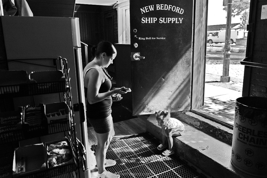 75L1020097BW A woman and young girl wait for a man to finish making his purchases at New Bedford Ship Supply before he heads out to sea from New Bedford harbor.
