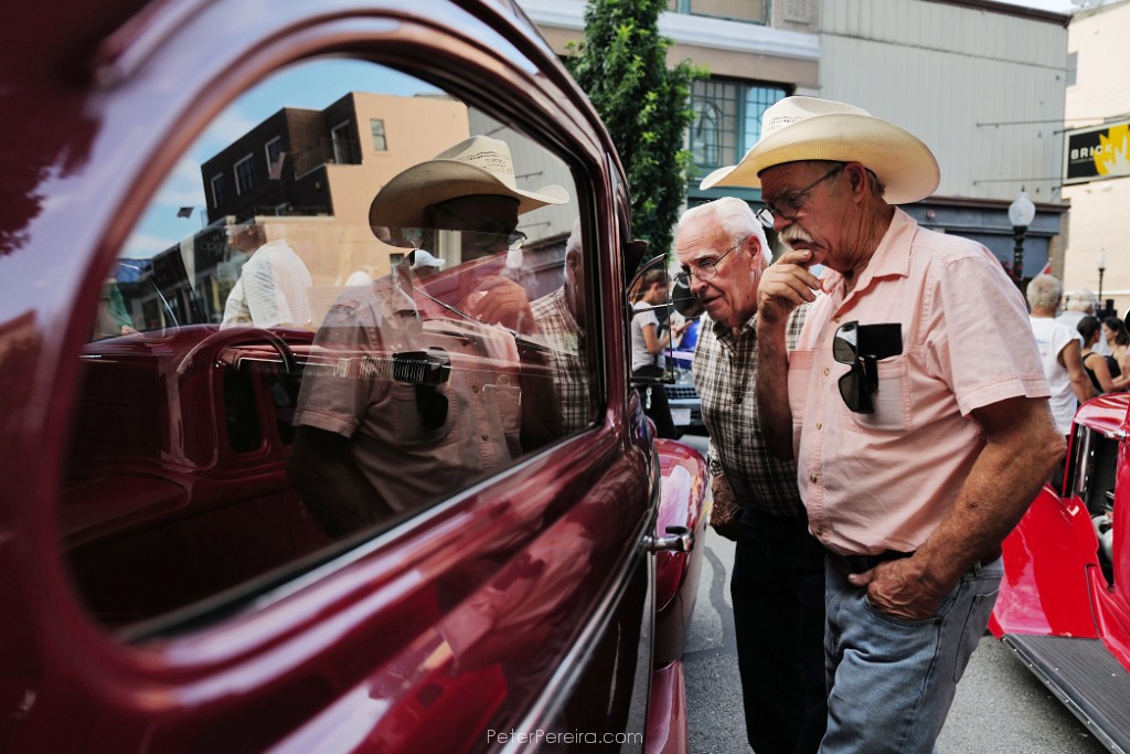 80L1020709 Two men take a closer look at one of the many vintage cars on display at the annual Joe Jesus' 50s Night in downtown New Bedford.