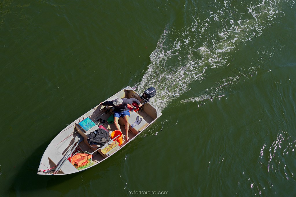 82L1021055-2 A man rides his boat as seen from the Route 88 bridge over the Westport River.