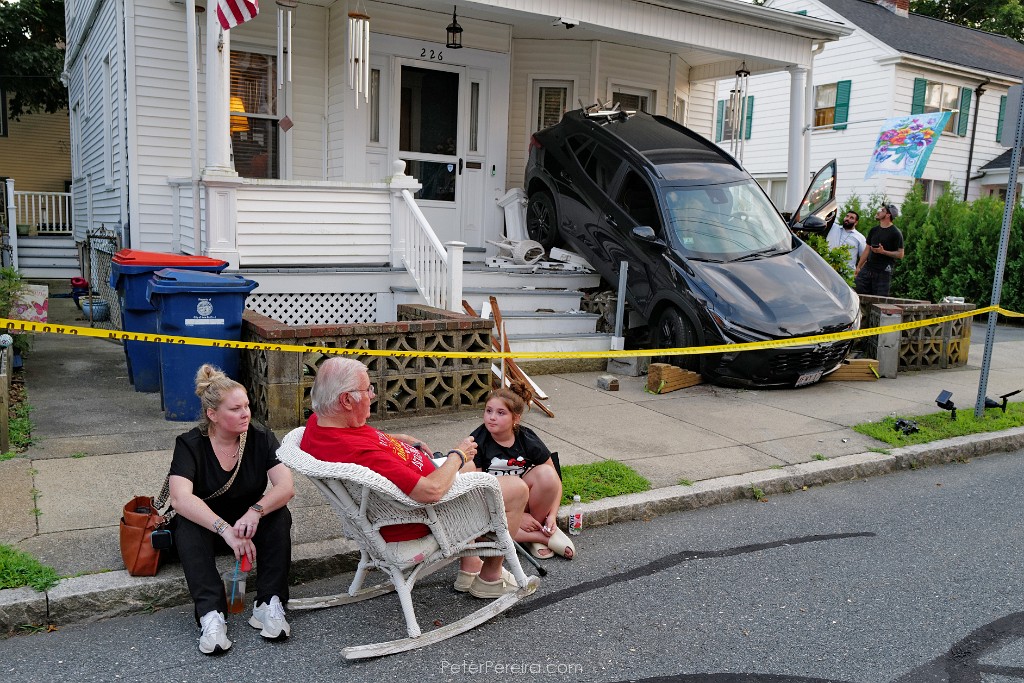 83L1021106 Byron Ford is joined by his daughter Lauren Amaral, left, and granddaughter Leiah Amaral, 11, after he was left stunned when a vehicle backed up onto the porch of his home on Maple Street in New Bedford. Mr. Byron who normally sits on his porch at this time of day, decided not to today. The motorist was parallel parking and hit the accelerator instead of break, no one was hurt.