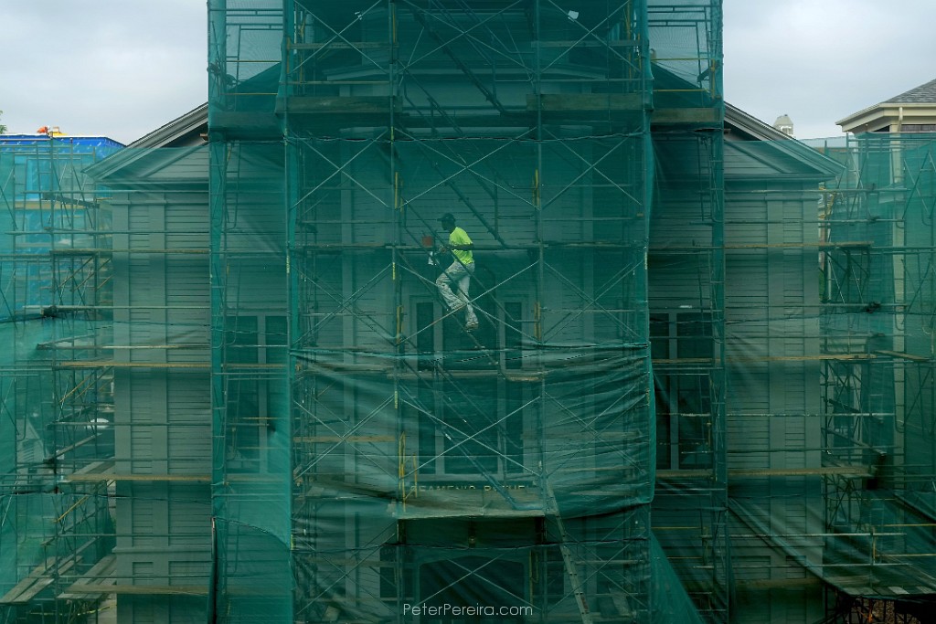 86L1021174-2 A JAG Painters worker makes his way up the staging in front of the Seamen's Bethel in downtown New Bedford, behind a protective green cover.