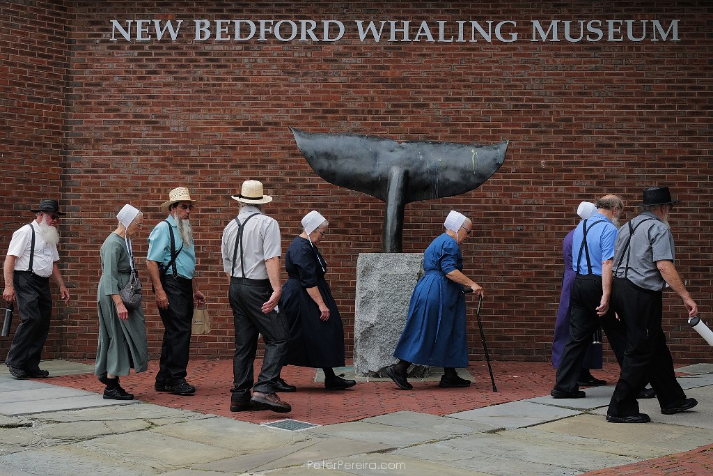 85L1021365-2 A group of Omish vistors to the city make their way past the whale tail outside of the New Bedford Whaling Museum
