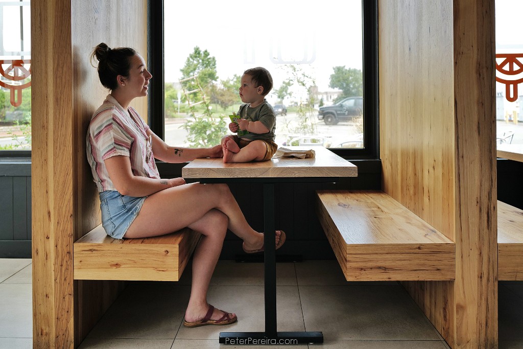90L1021984 Lexi Malloy and her one year old son, Connolly Malloy, enjoy a moment together in one of the booths of Ground Floor Coffee in New Bedford.