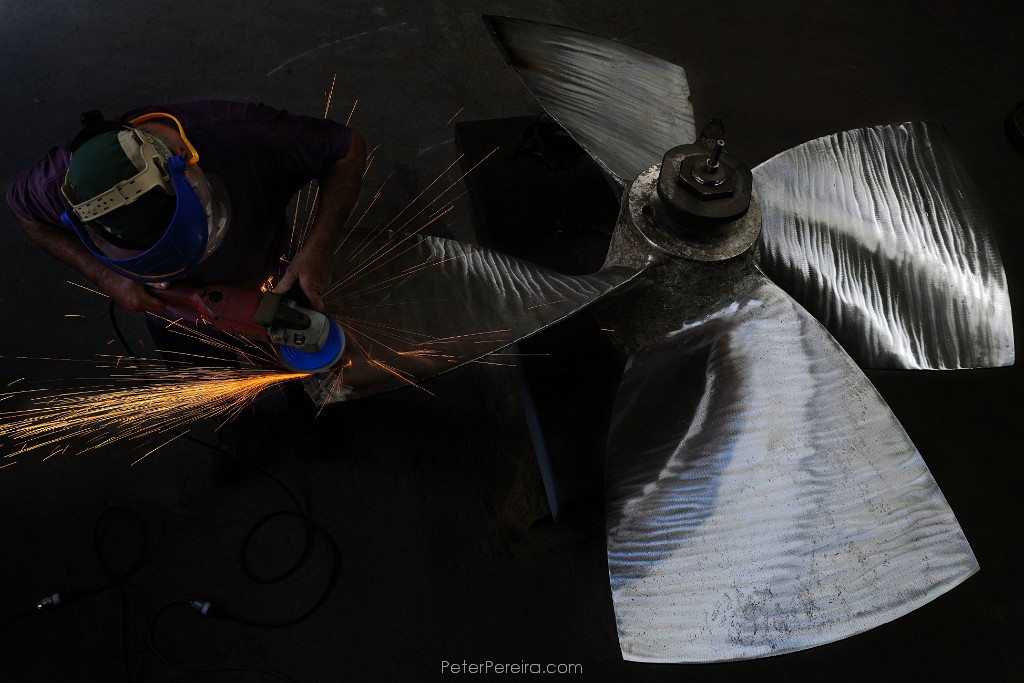 91L1022165 John DeMello, propeller technician at Scandia in Fairhaven, sends sparks flying as he makes repairs to a stainless steel propeller from a fishing boat.