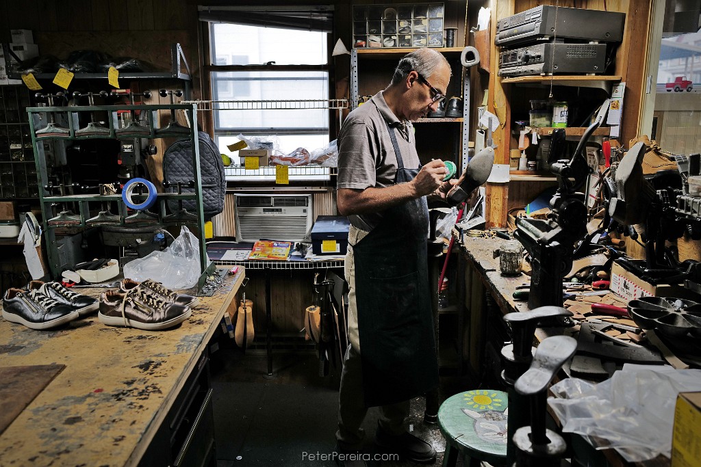 94L1022285 Scott Amorin glues the sole of a shoe he is fixing at the New York Shoe Repair on Dartmouth street in New Bedford.