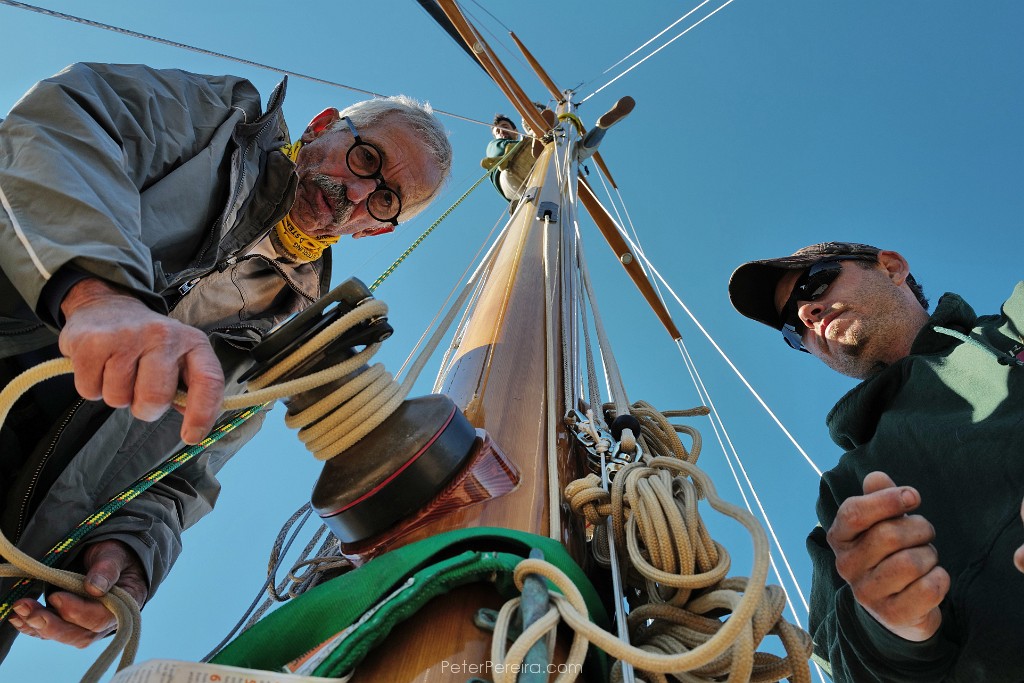 106L1024047 Joe Mello, left, and Jason Costa, right, of Triad Boatworks remove the rigging from the mast of a sailboat docked in Mattapoisett, as Silas Costa looks down from above as he sets up a strap to remove the mast.