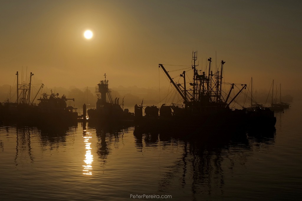 108L1024270 The sun rises above Pope's Island Marina in New Bedford on a foggy morning.