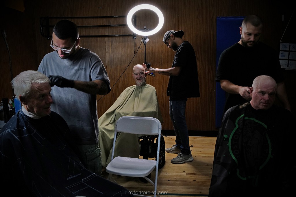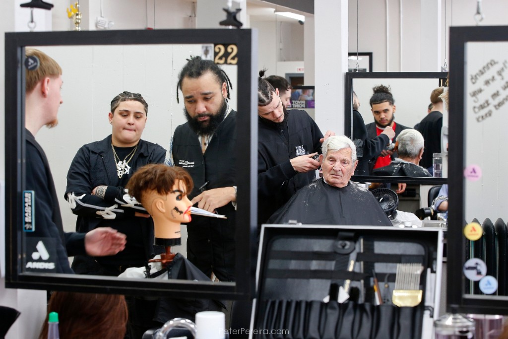 109L1024321 Keehan Arruda, Mission Barber Shop, Stevie Monteiro, Mission Barber Shop and Jared Rodrigues of The Spot Barber Lounge, volunteer their time to give Chris Dickinson, Liam McBrien and Ray Morin haircuts at the annual New Bedford Connect RiseUpForHomes.com conference held in the New Bedford YMCA with various resources and services for individuals for families who are unhoused or are at risk.