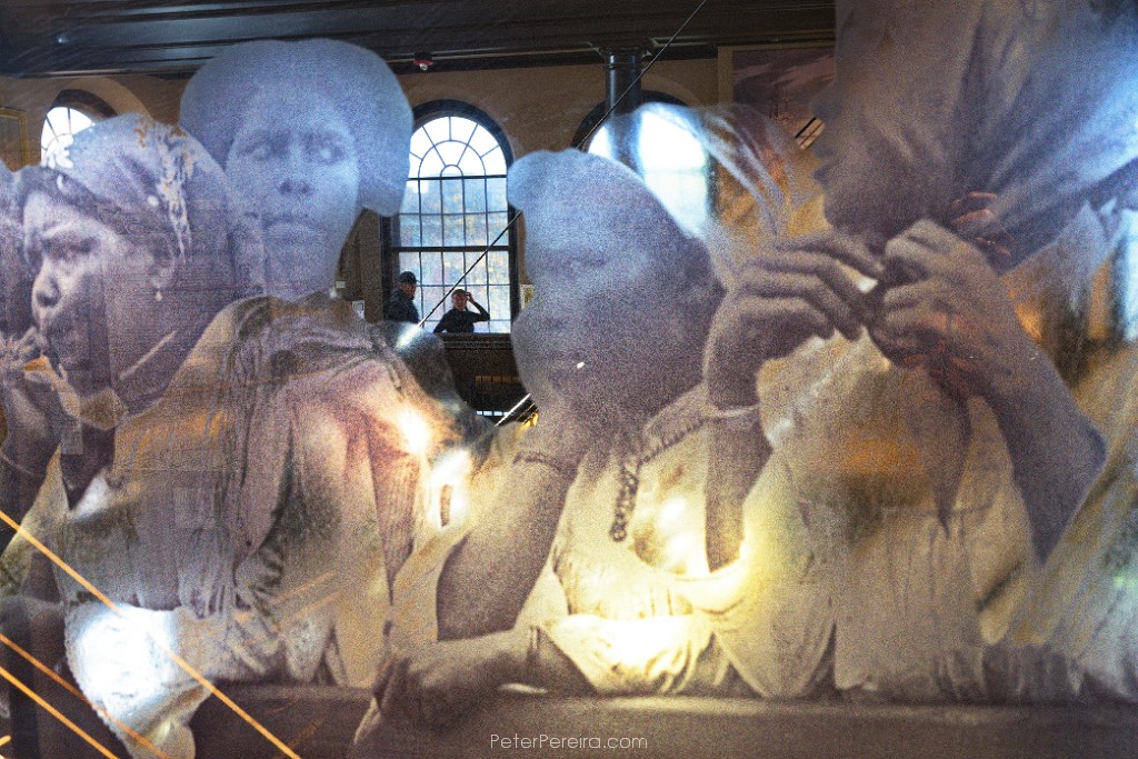 111L1024382 A transparency photo of Cape Verdean immigrants arriving in the United States in 1920 seen behind the model of the Ernestina-Morrissey schooner keep their eyes on a couple making their way across the upper level of the New Bedford Whaling Museum.