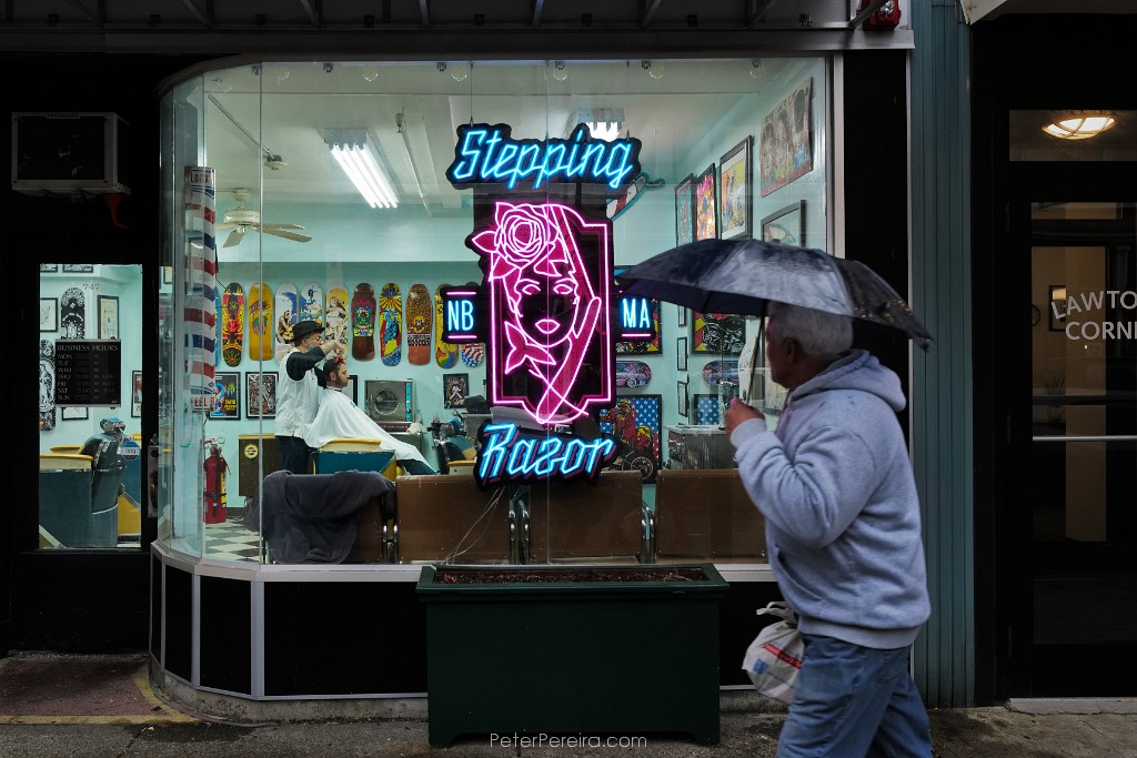 121L1025521 Danny Baptista, owner, gives Alex Buchanan a haircut inside of the Stepping Razor barber shop on Purchase Street in New Bedford, as a man takes shelter from the driving rain with an umbrella as he walks past outside.