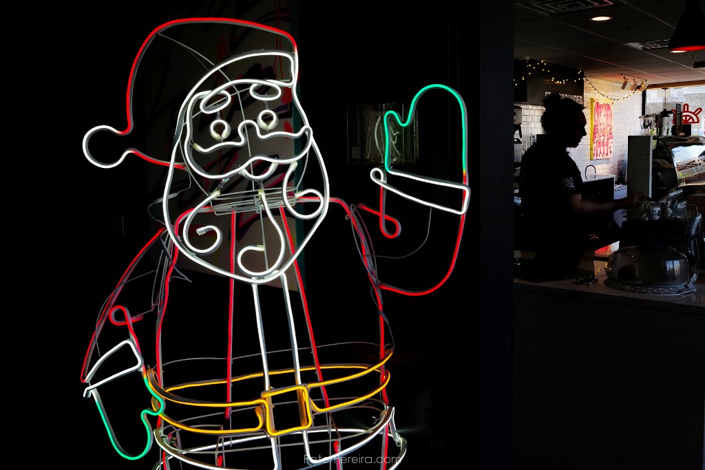 128L1025672 A neon Santa welcomes guests to Ground Floor Coffee in New Bedford as Cole River takes an order inside the waterfront cafe.