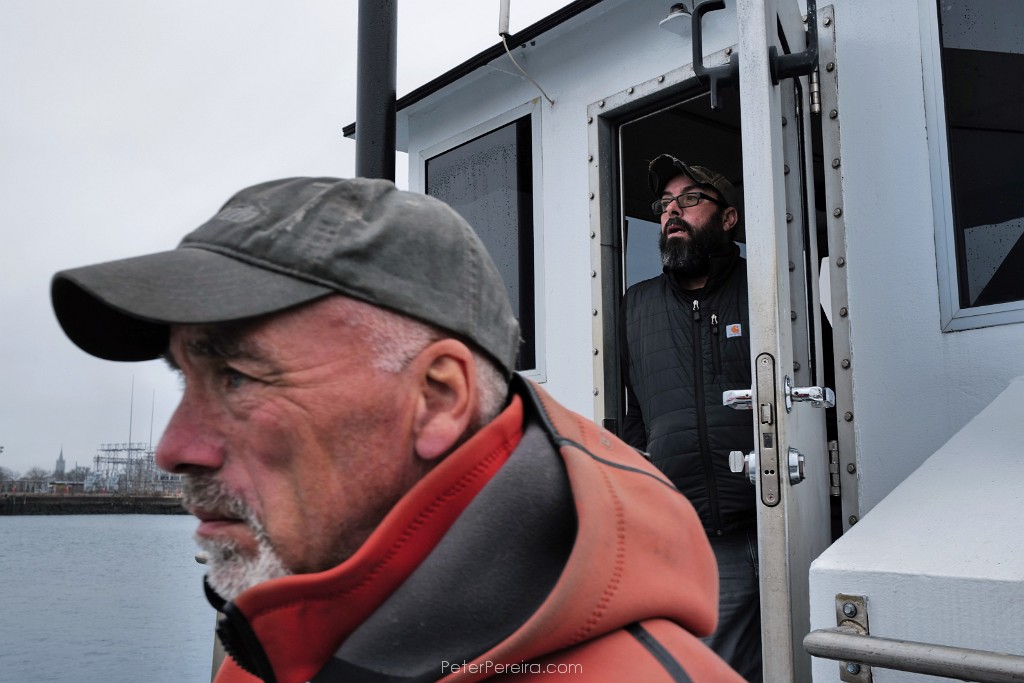 132L1025850 Bob Bower, left and Alvaro Salvador, owner, keep their eyes on other boats crossing the harbor as they make their way aboard the the Bay Fuels re-fueling barge to bring petrol to a scalloper docked in New Bedford