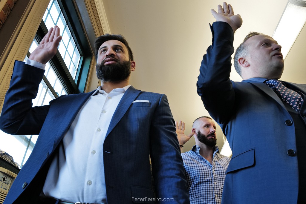135L1026110 (l to r) Samarth Patel, India, Goce Jankovski, North Macedonia and Jonathan Wcislo, Scotland, pledge the Oath of Allegiance during a naturalization ceremony held at the Immigrants' Assistance Center in New Bedford where twenty-three people from fifteen countries became United States citizens.
