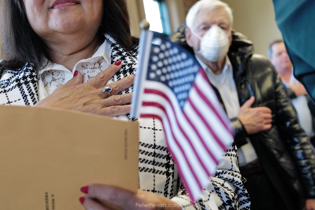 134L1026128 New citizents Pledge Allegiance during a naturalization ceremony held at the Immigrants' Assistance Center in New Bedford where twenty three people from fifteen countries became United States citizens.