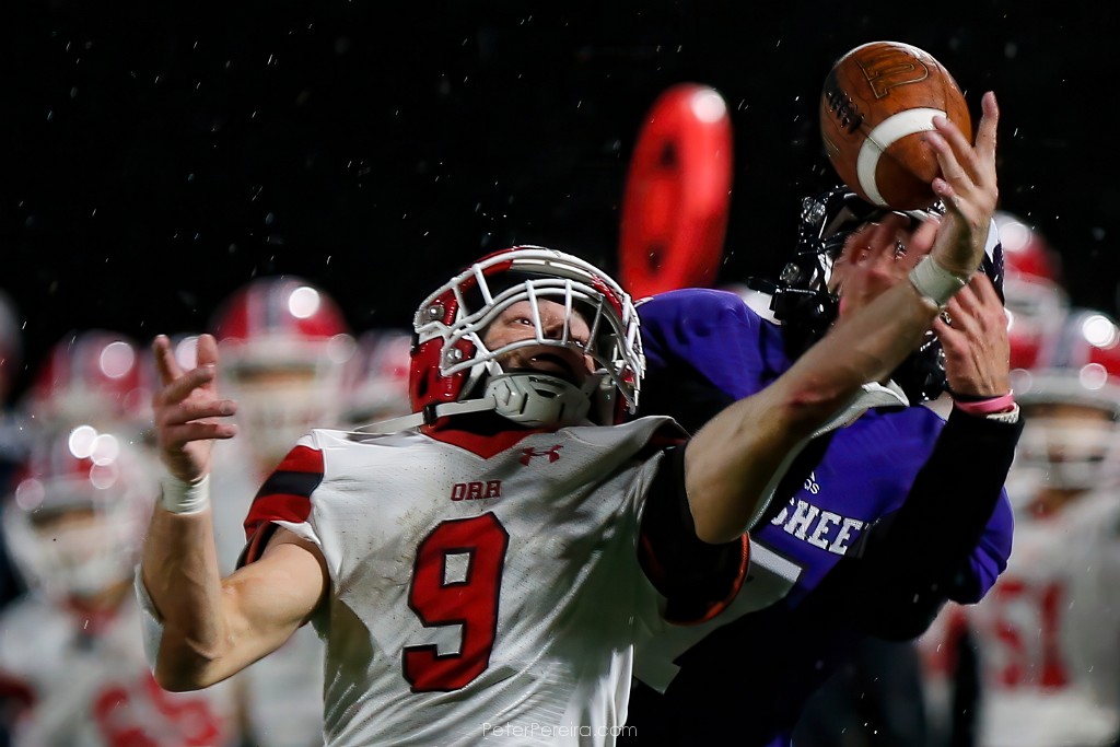 122VE13976 ORR defensive back Jack Leconte makes the stop on the pass to Shawsheen's Syllon Pratt during Old Rochester Regional High School's loss to Shawsheen Valley Technical High School in the playoff game played at Scituate High School.