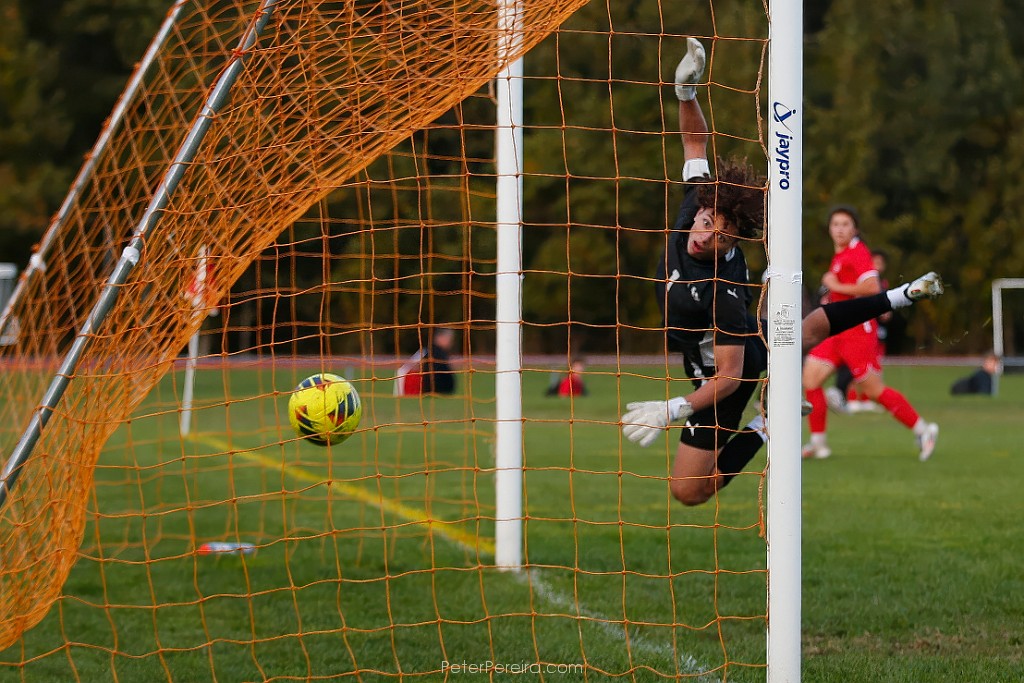107VE14147-2 Voc-Tech goalie Christian Alturas can do nothing but look at the ball go into the back of the neck after a fantastic floating ball shot by ORR's Colin Mello (seen in background) during the Old Rochester Regional versus Voc-Tech boys soccer game.