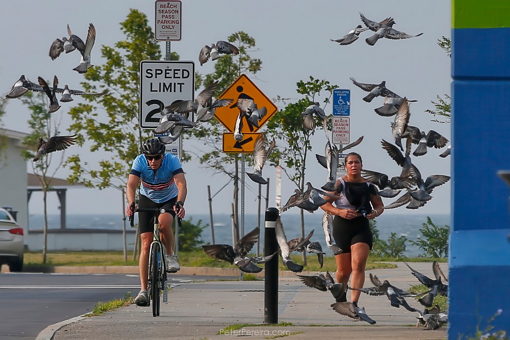 84VE17863 A cyclist and runner are surrounded by pigeons as they make their way down the Blue Lane on West Rodney French Boulevard in New Bedford.