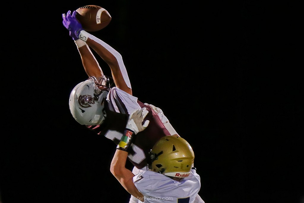 110VE19793-2 Stang wide receiver Try Gonsalves Cosme elevates for the catch as Archbishop Williams' Devin Sheehan makes the defensive play during Bishop Stang High School's win at home against Archbishop Williams High School.