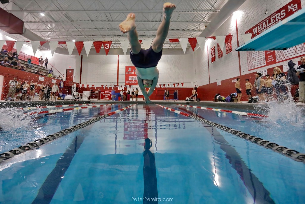 4V_M1A2730 Apponequet's Levi Jope enters the water before winning the 100 meter freestyle race during New Bedford High School swim meet against Apponequet High School in New Bedford.