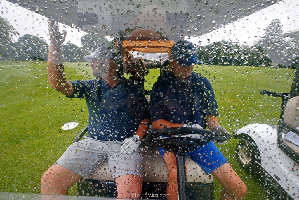 88E10126 Teammates Eric Bonneau and Adam Mathes take shelter from the driving rain in their golf cart at the 94th Annual Four-Ball Tournament at The Country Club of New Bedford.