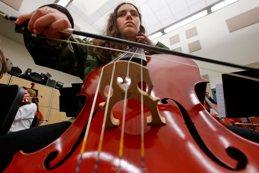 25E10738 Dartmouth High School orchestra celloist, Cynthia Scott, 17, practices a composition written by Soon Hee Newbold, who is visiting their school.