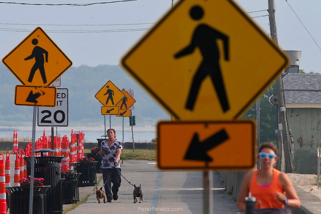 74E10884 A woman and two dogs are surrounded by pedestrian crossing signs as they make their way down the Blue Lane walk along East Rodney French Boulevard, while another jogs.