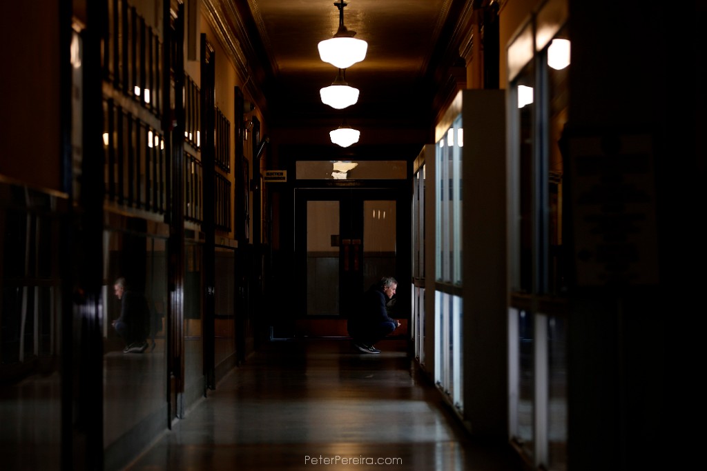 18E17173 A woman makes her way to New Bedford City Hall as seen through a gap in the books at the New Bedford Public Library.