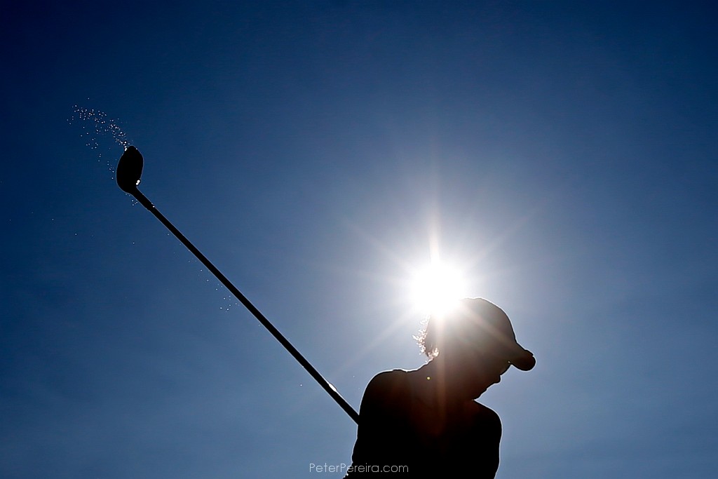 92E11087 Water from a wet turf is seen on the club of Kim Walecka as she tees off at the Country Club of New Bedford 45th Women's Four-Ball Invitational