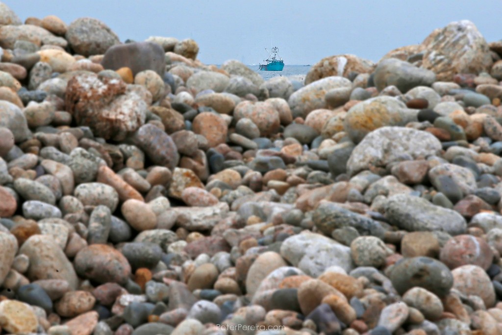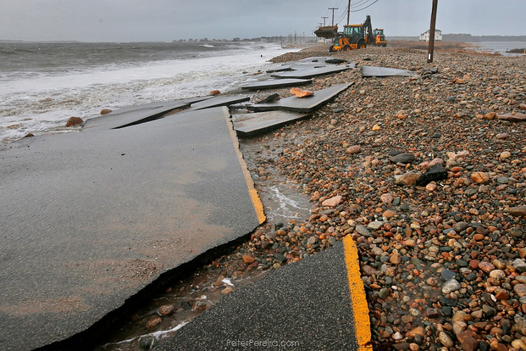 45E1_1257resize A lobster boat is seen between a trough in the stones piled up on the edge of East Beach Road in Westport.