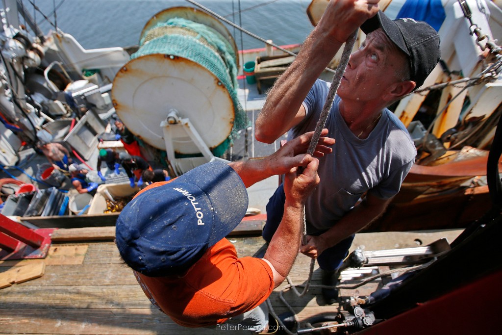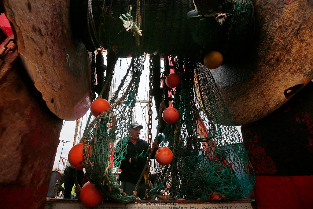 36E15620 Luis Rios mends the nets aboard the fishing boat Fisherman before heading back out to sea from New Bedford.
