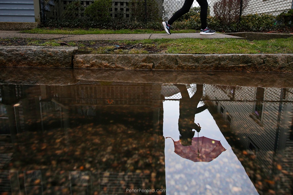 46E12098-2 A woman is reflected on a puddle on the side of the road as she makes her way up Union Street in New Bedford on a rainy day.