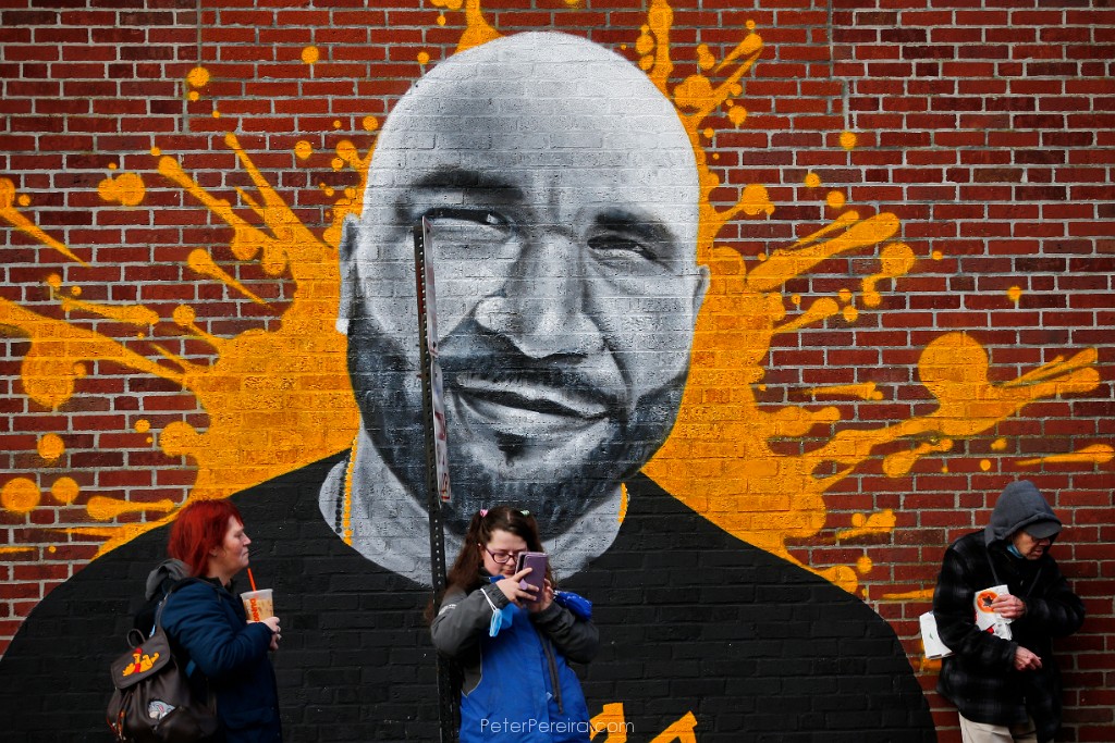 35E12172 People waiting for the bus have big company in the mural of a man painting on a building on Pleasant Street in New Bedford.