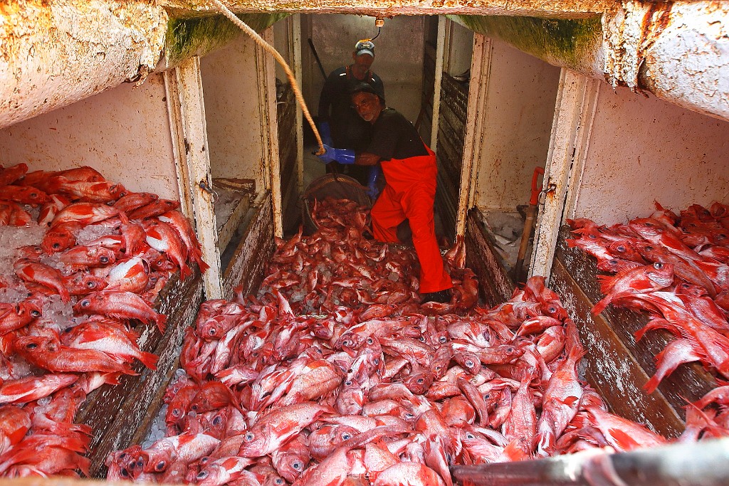69E12342 Lumpers, Chris Silva and John Mills are seen below deck as they unload the Acadian redfish from the fishing boat Kyler C at the Whaling City Seafood Display Auction building on Hassey Street in New Bedford.