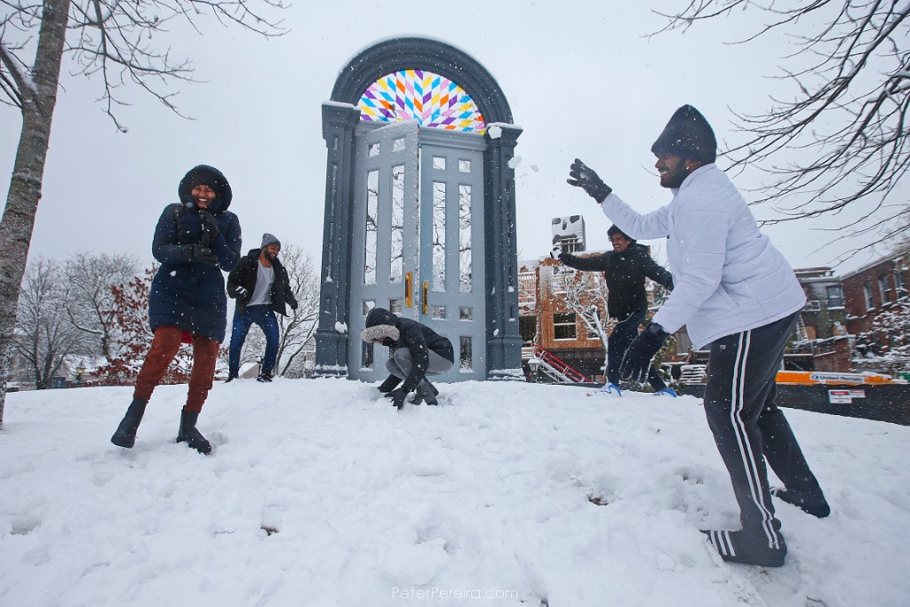 27E12419 UMass Dartmouth engineering students from Hyderabad, India play with snow for the first time ever at Custom House Square in New Bedford, MA on February 13, 2024 as heavy snow falls across the region.