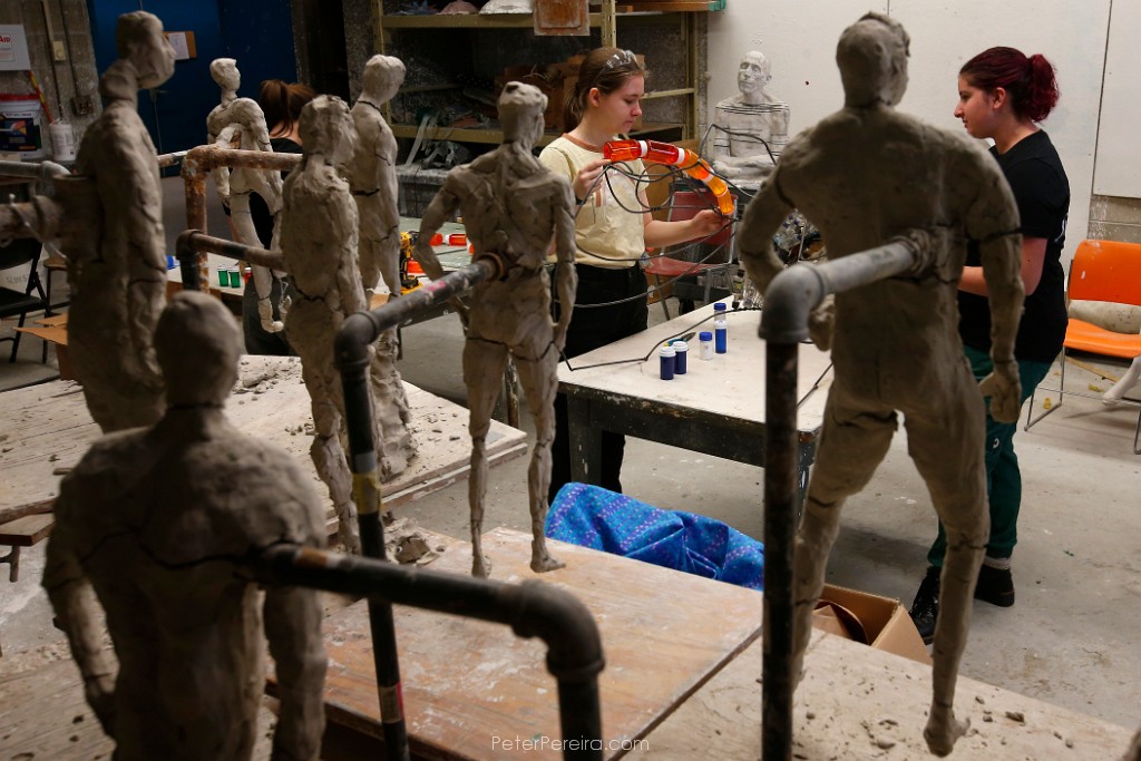 47E12424 Clay on wire figures from body as concept class look on as Katie Erwin and Maddie Gonzalez work on the head of the nips bottles monster. The 'Monster Creature from the Plasticine Era' made with over thirty two thousand discarded nips bottles around a metal framework, will be marched by students in the upcoming A-Ha Earth Eve Procession in downtown New Bedford.
