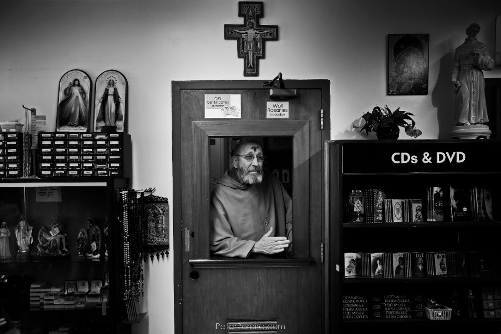 28E12538BW Franciscan Father Joachim speaks with people visiting the gift store at Our Lady's Chapel in downtown New Bedford after delivering Ash Wednesday Mass.