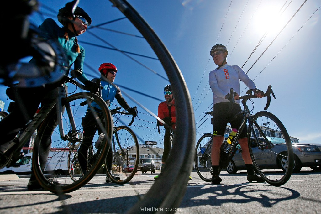 10E13218 Cyclists decide on what route to ride as they wait for the Padanaram bridge to open in Dartmouth. Unfortunately the bridge never opened after encountering a mechanical issue.